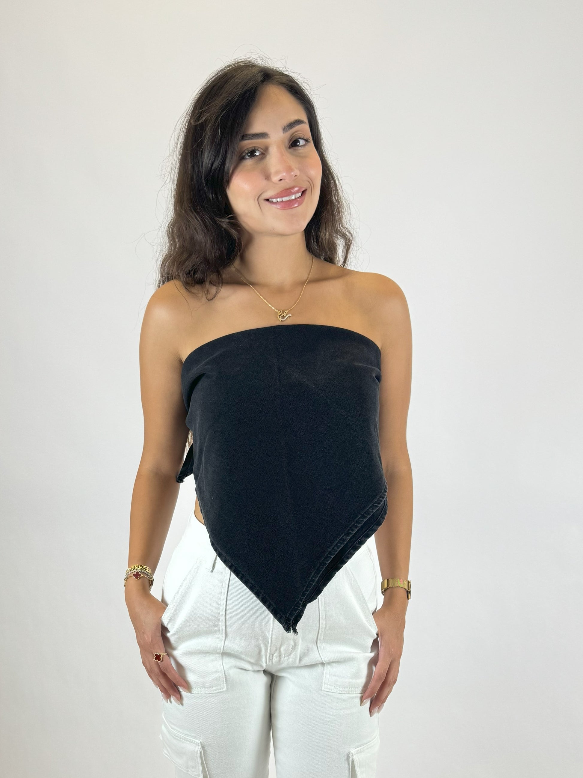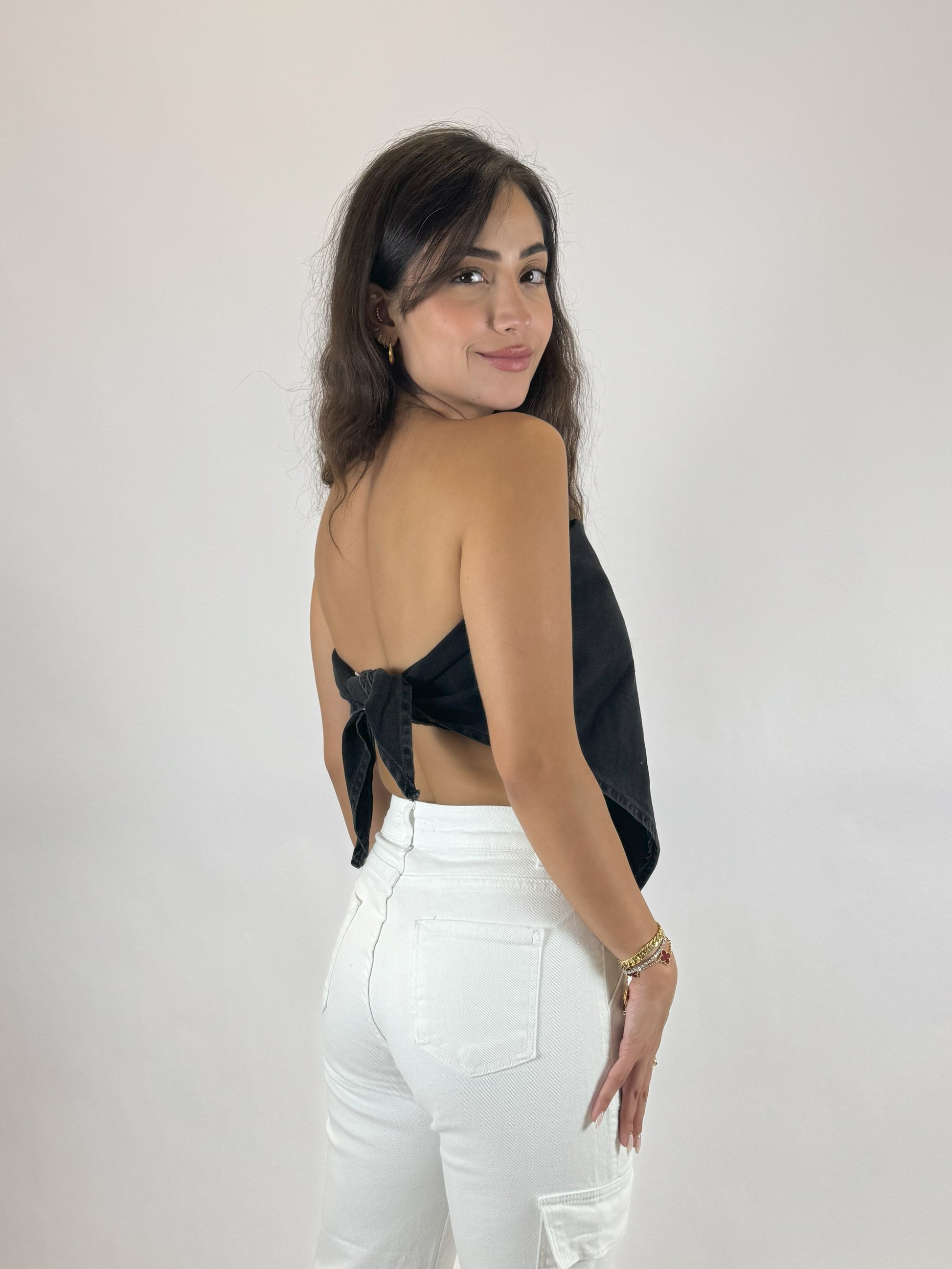 A fresh take on a classic — this cropped denim top features a clean front and an adjustable tie-up back for a perfect fit and stylish reveal. Crafted from structured denim, it balances bold structure with soft femininity.