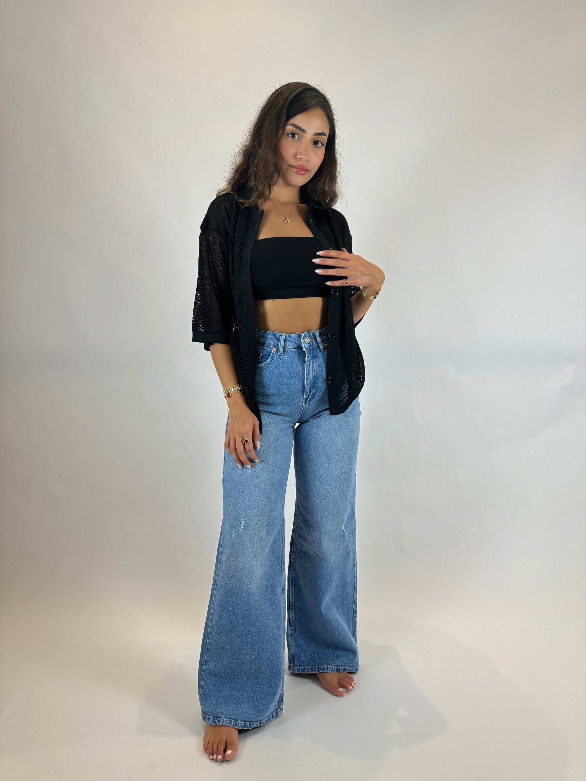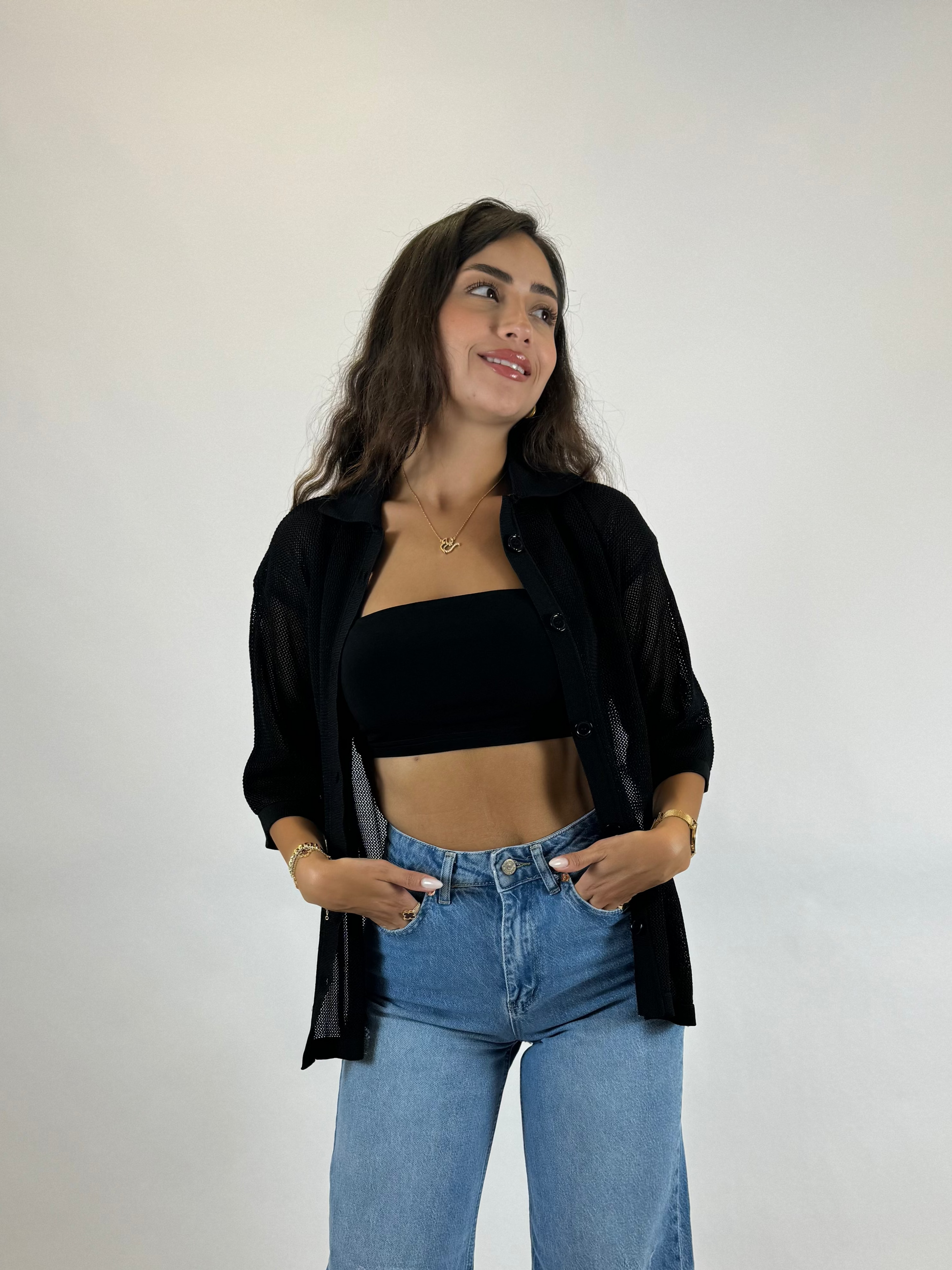 Lightweight and effortlessly cool, this sheer black shirt is the perfect layering piece. Designed with a loose fit and short sleeves, it can be worn open for a relaxed vibe or buttoned up for a sleek finish — the ultimate styling staple for warm-weather outfits.