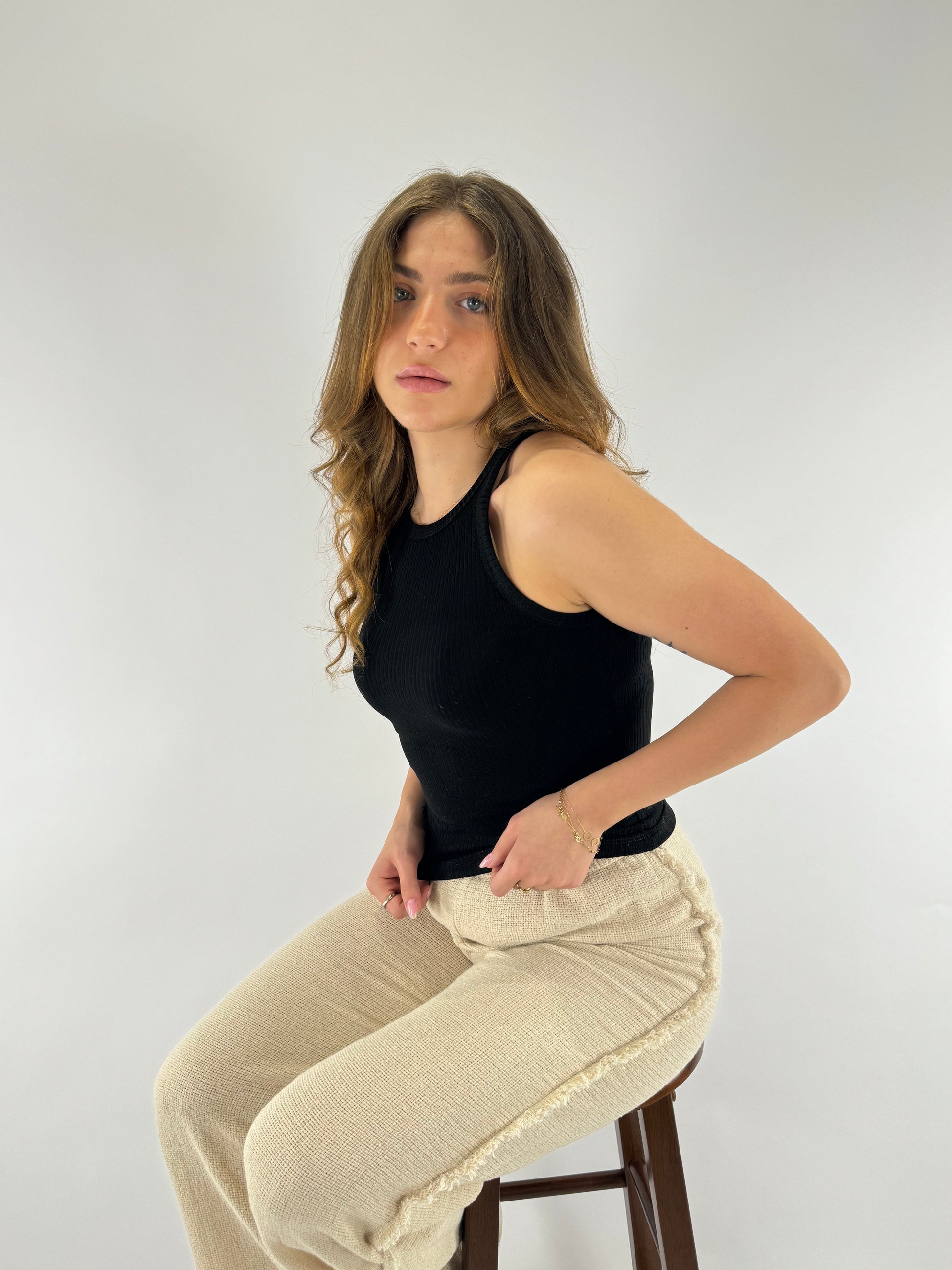 A wardrobe staple, this fitted ribbed tank top features a classic crew neckline and a flattering silhouette. It's crafted in a soft, stretchy fabric that hugs the body comfortably.