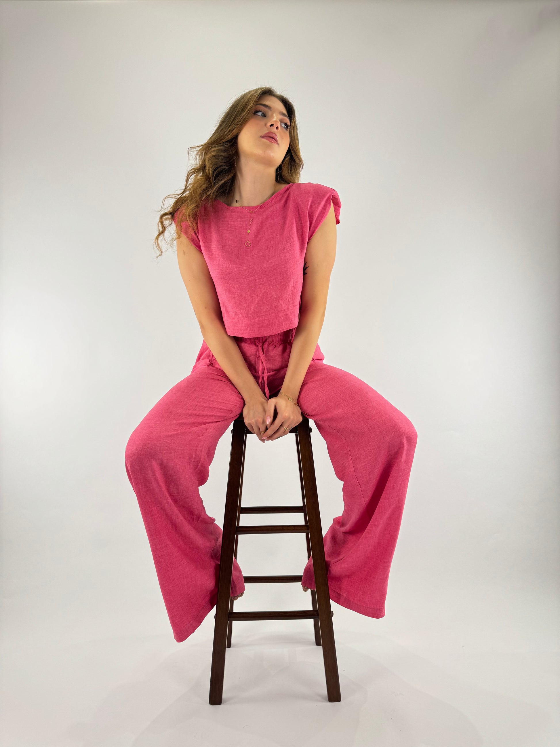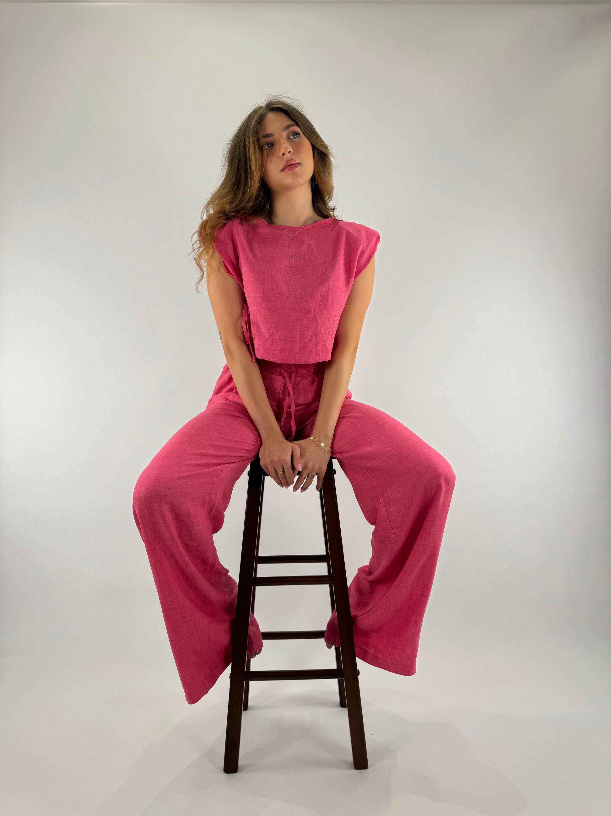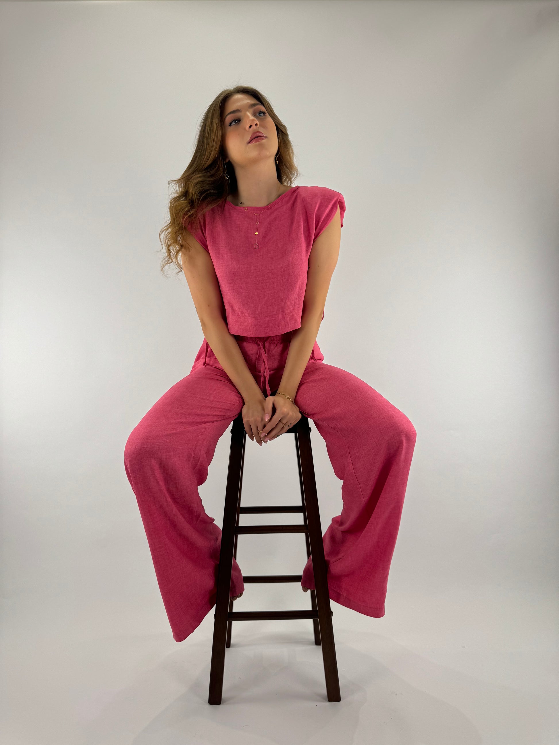 Stay cool and bold in this fuchsia linen set, featuring a lightweight, breathable fabric perfect for sunny days & stylish getaways. A vibrant take on effortless elegance.