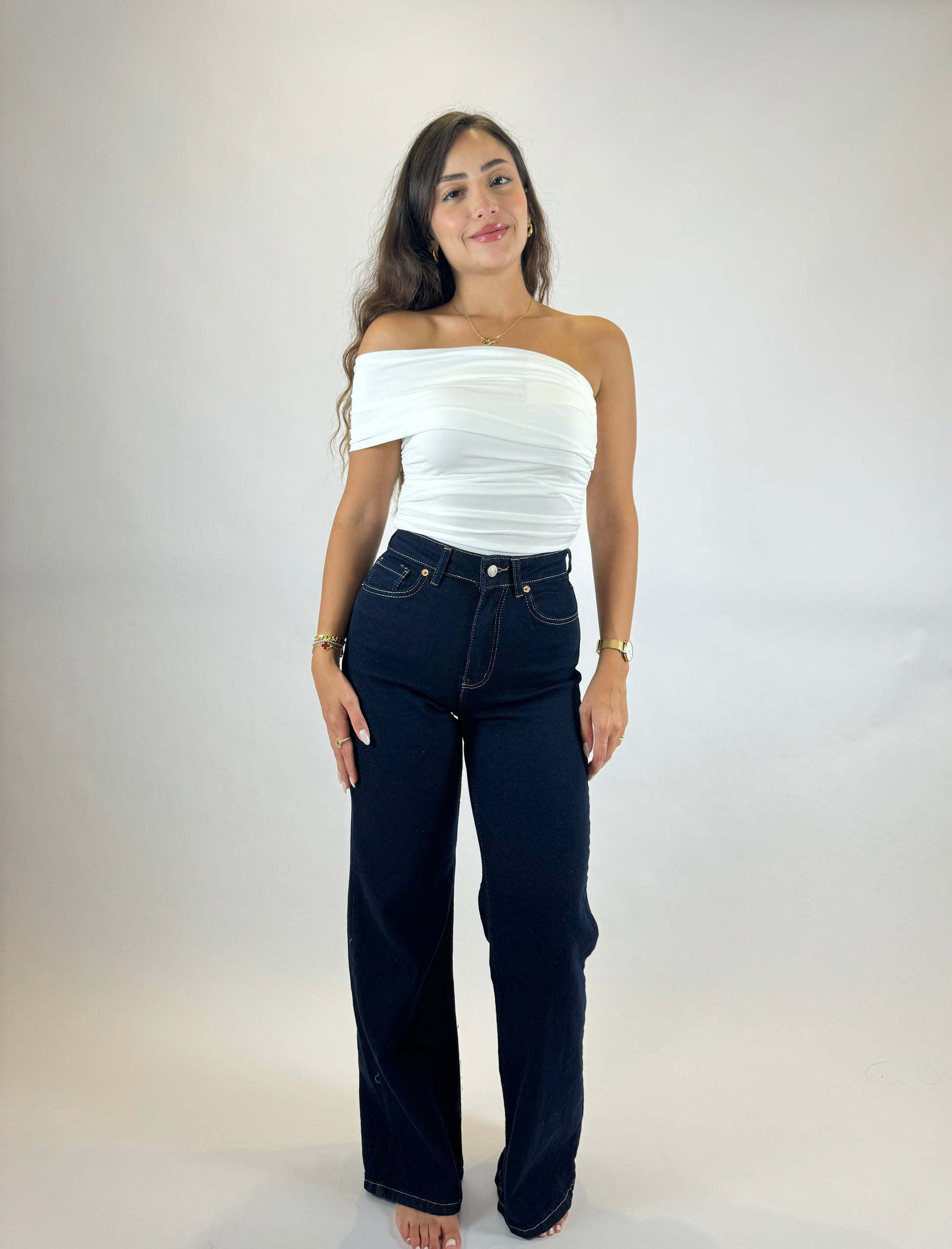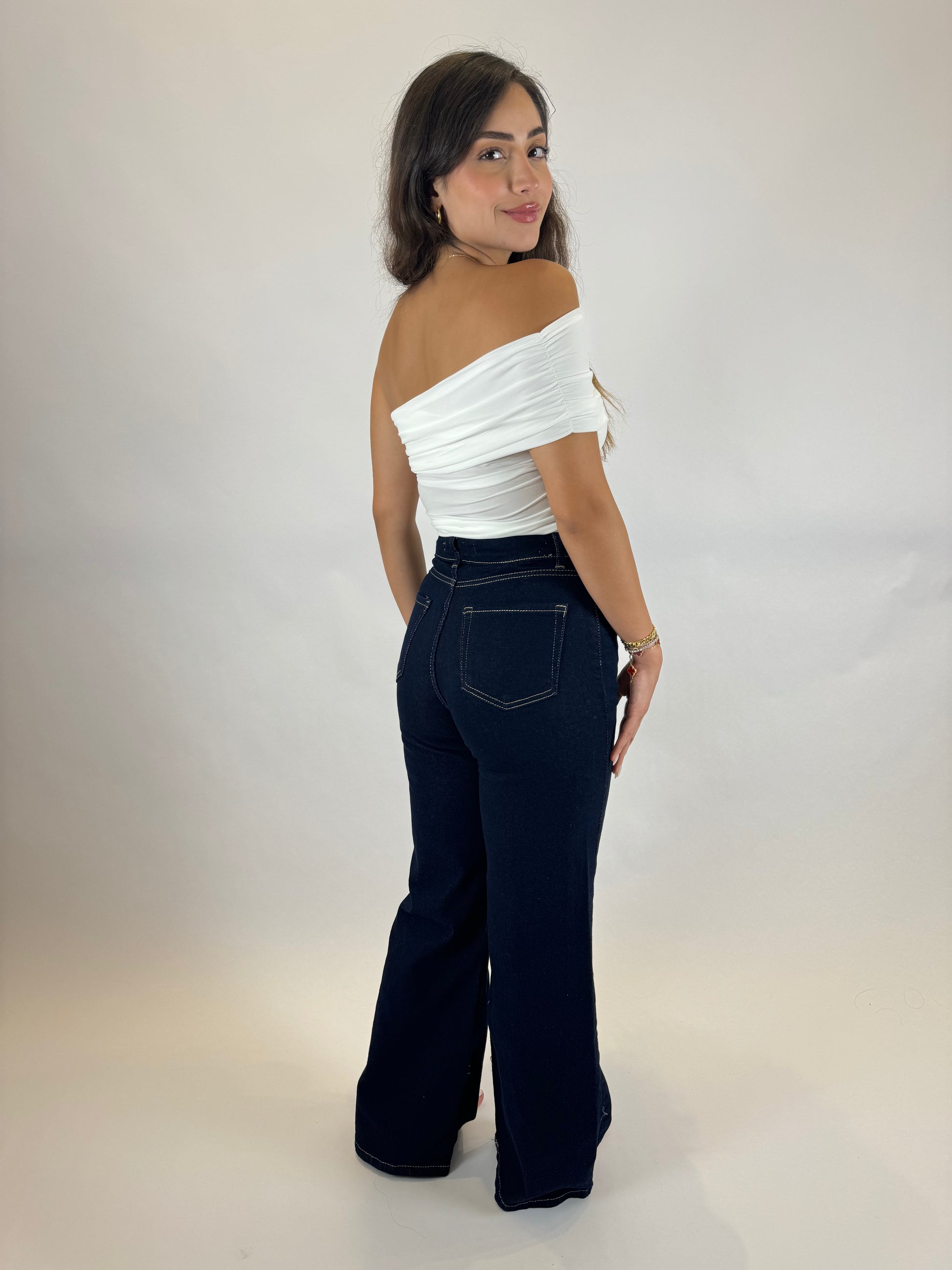 A wardrobe essential with a bold twist — these high-rise flared denim trousers sculpt the waist and flow into a wide silhouette for a confident, feminine look. Stylish, comfortable, and easy to dress up or down.