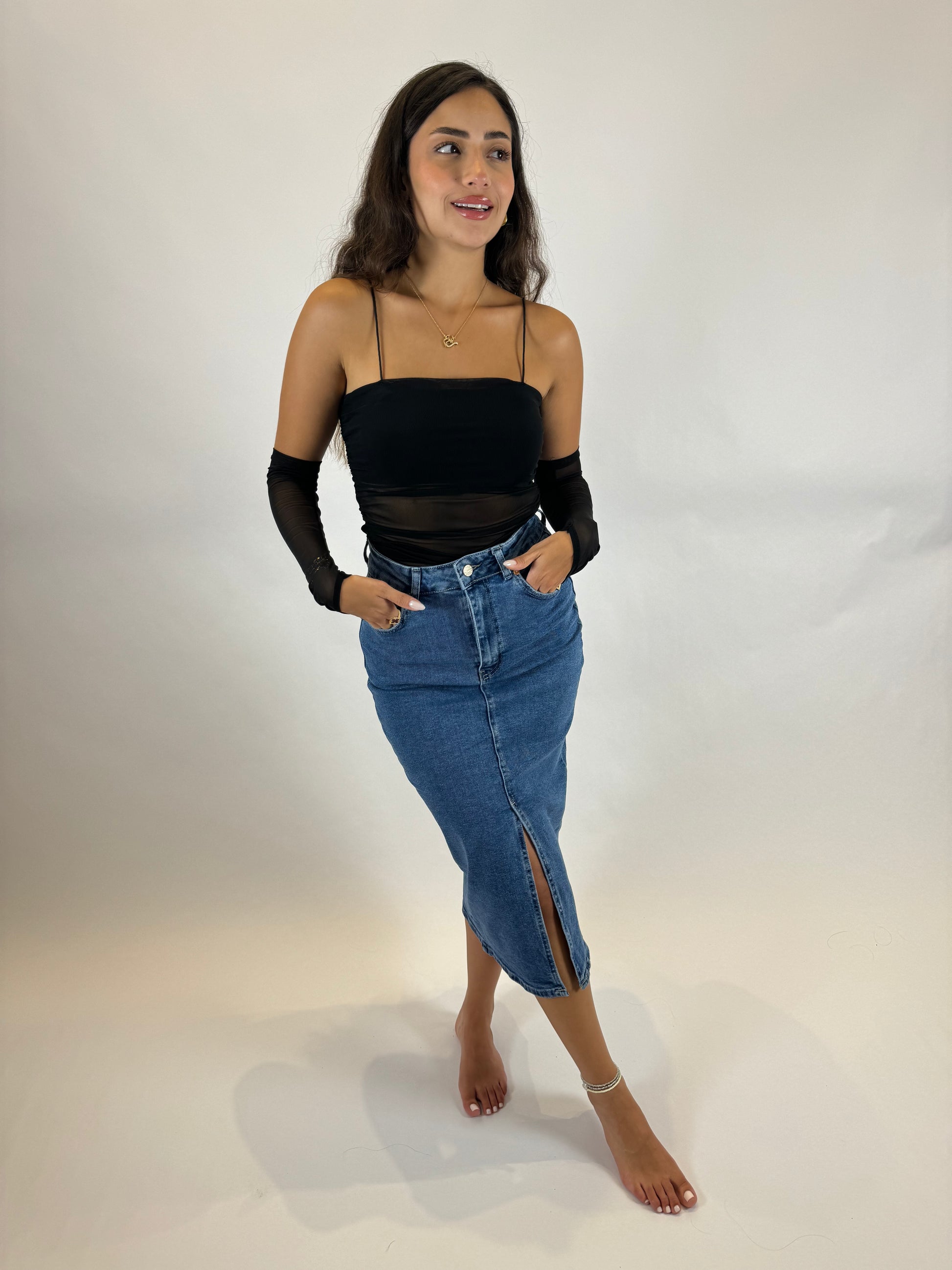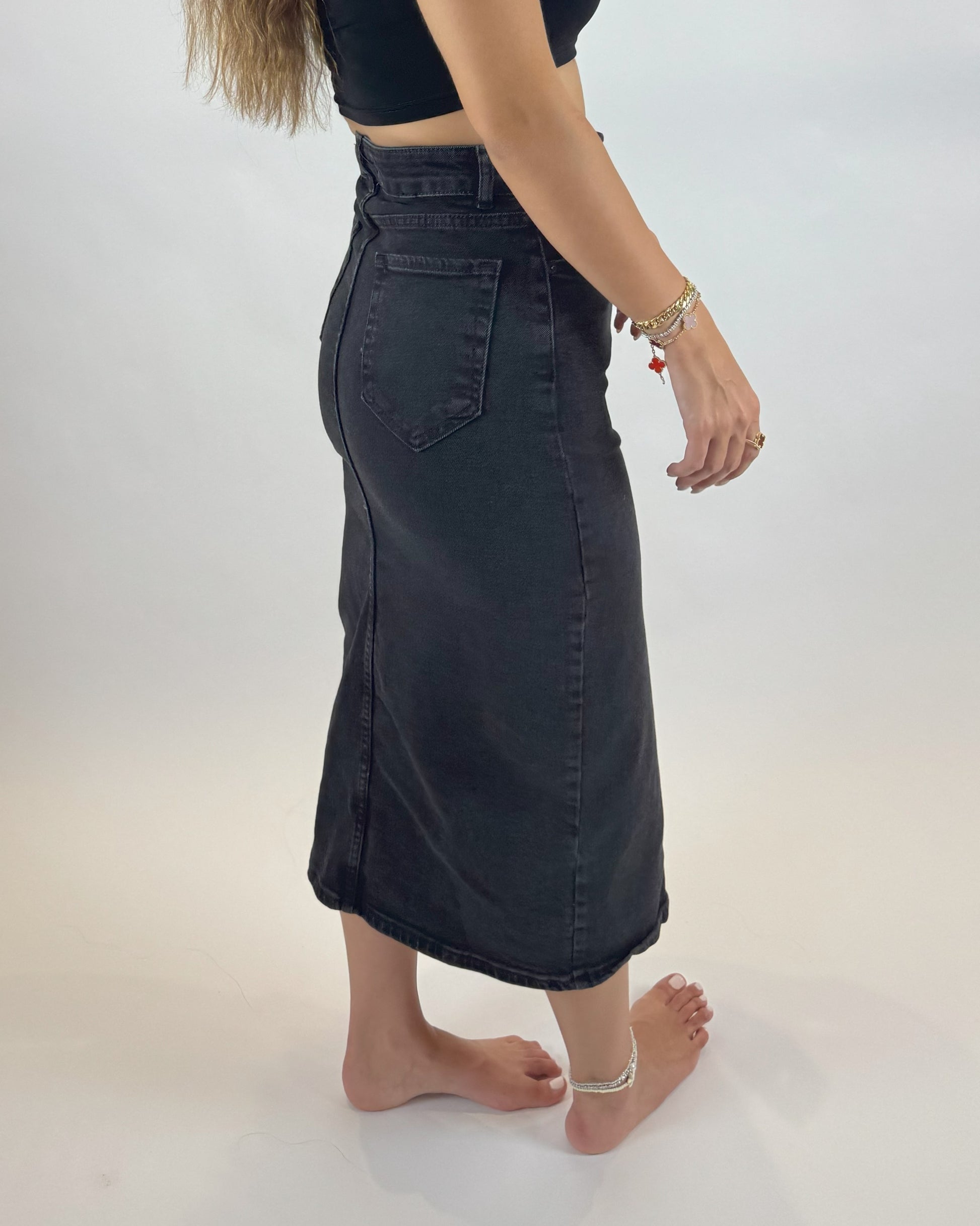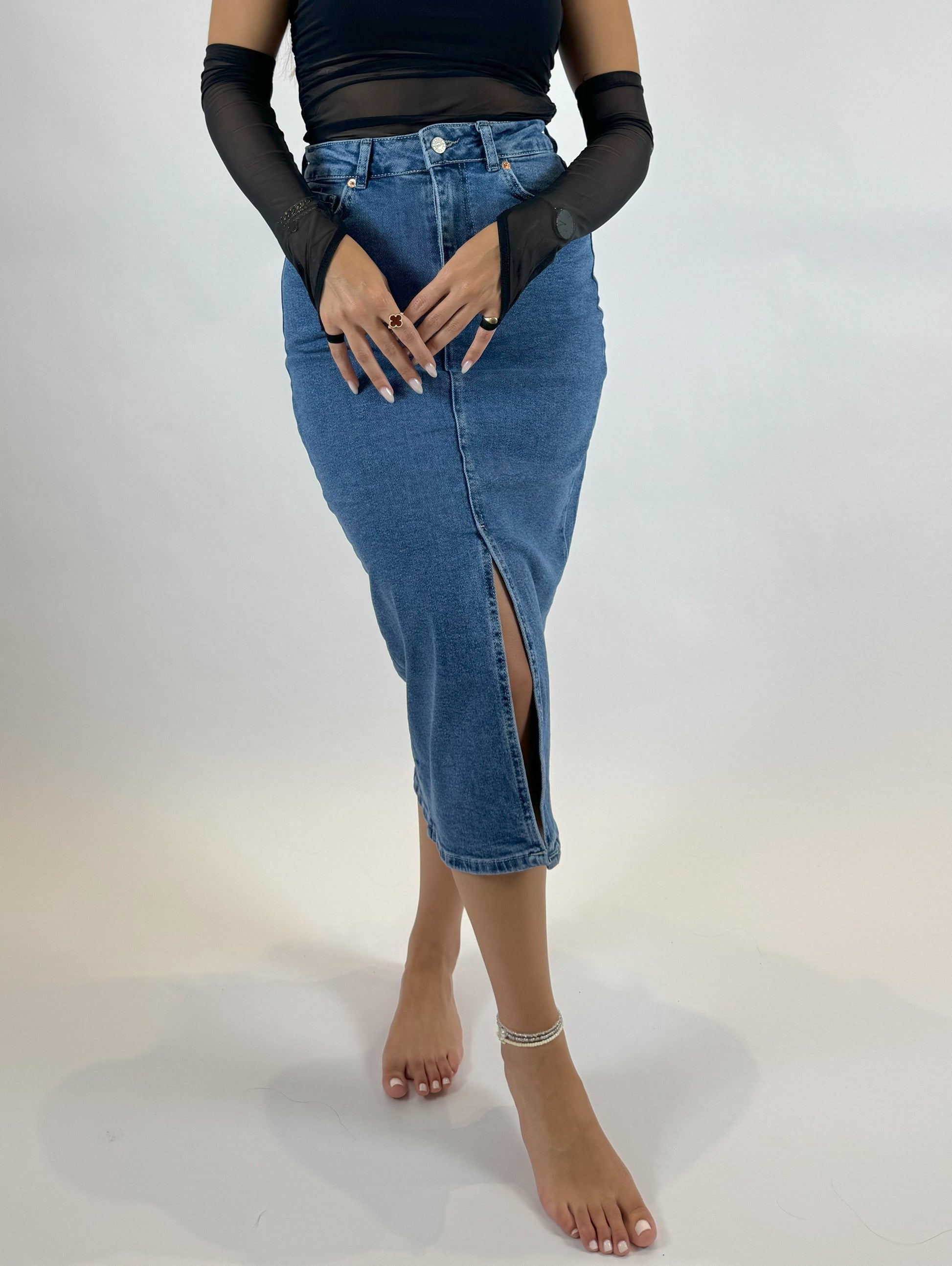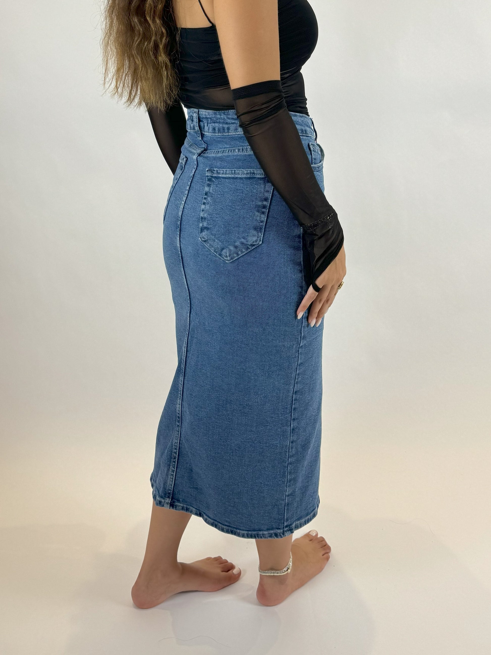 A timeless piece with a modern edge — this long denim skirt features a high waist, clean lines, and a flattering straight silhouette. Perfect for casual days or elevated with heels, it combines the classic look of jeans with the femininity of a maxi skirt.