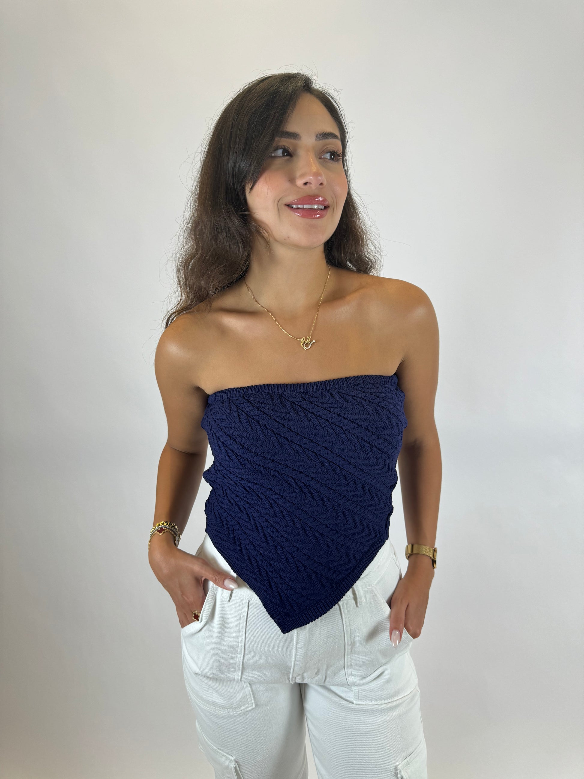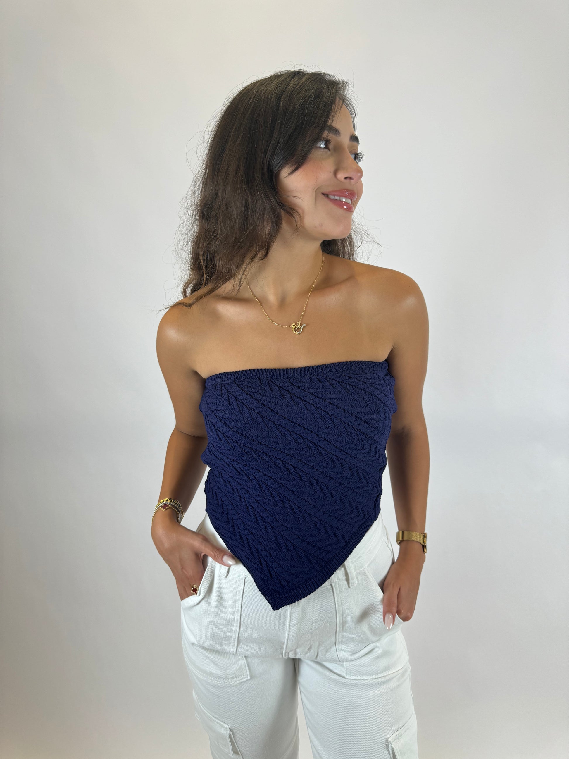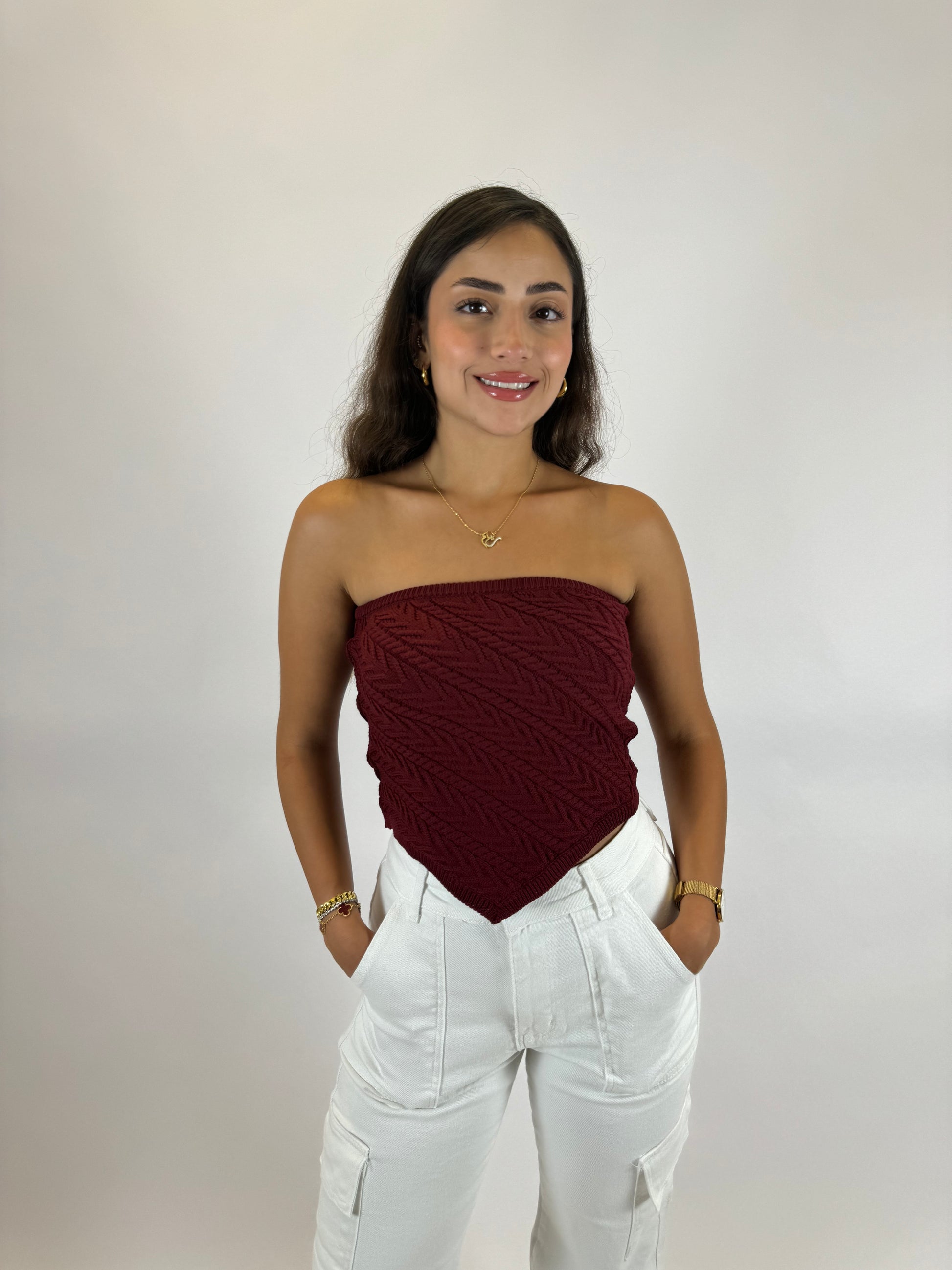 Flattering and bold, this strapless top hugs the body with a textured, sculpted fabric and a pointed hem for a standout silhouette. Ideal for pairing with high-waist pants or skirts, it adds a touch of elegance with a modern edge.