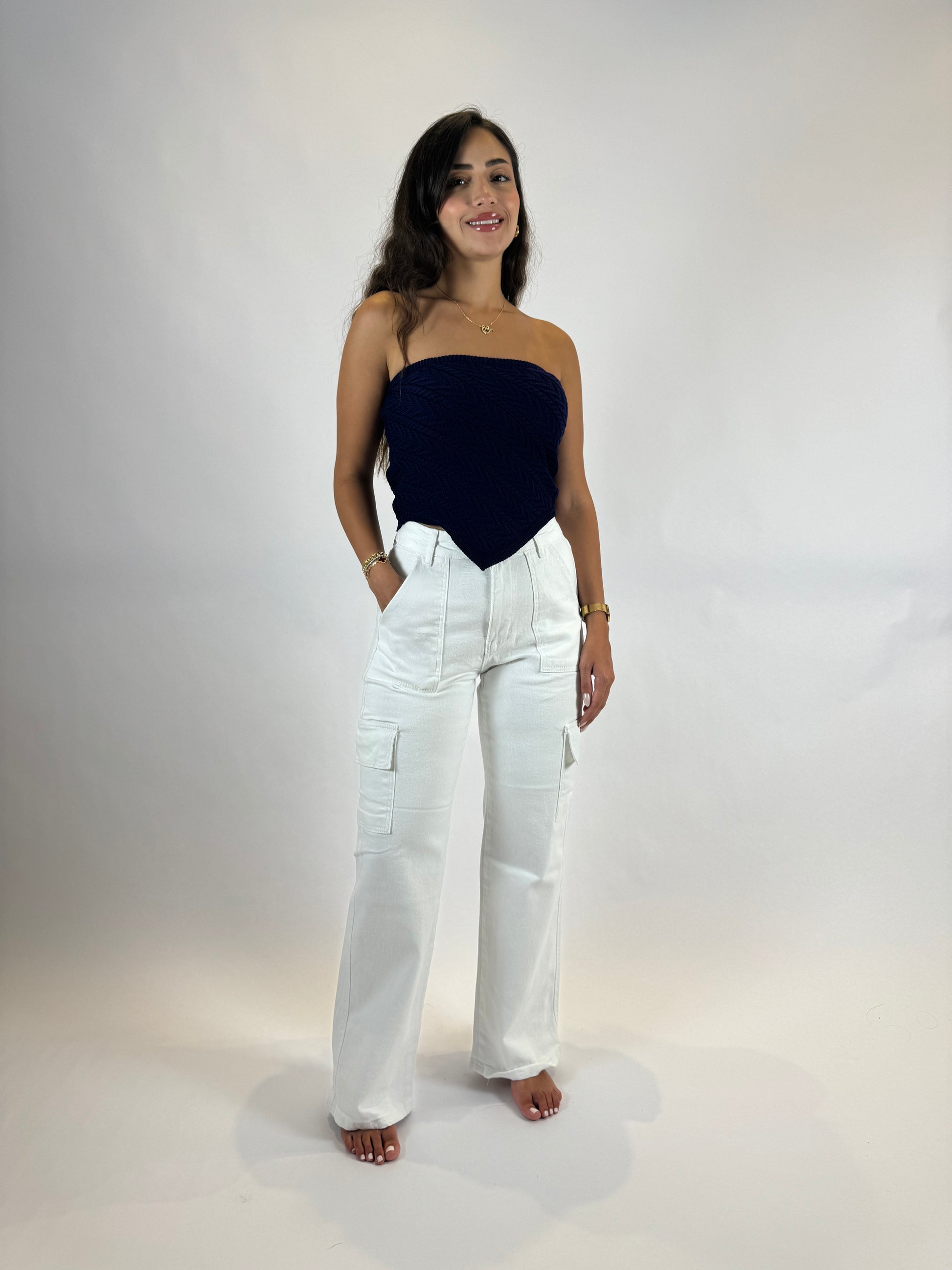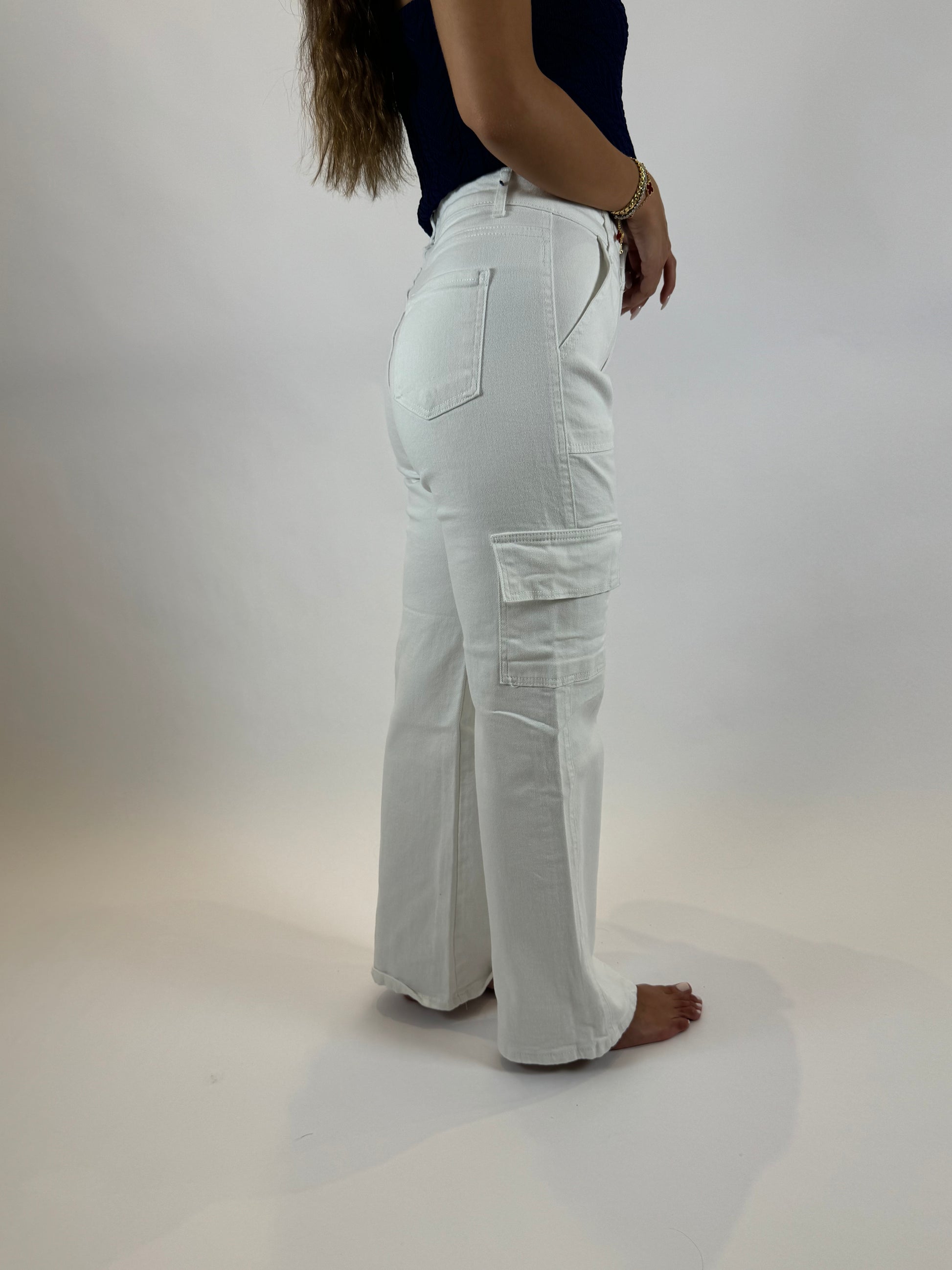 A modern twist on a streetwear classic — these high-waisted white cargo jeans feature a relaxed straight-leg fit with multiple functional pockets. Perfect for an effortlessly cool and edgy look that still feels clean and crisp.